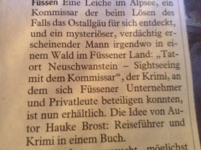 Eine Leiche im Alpsee, ein Kommissar, der beim Lösen des Falls das Ostallgäu für sich entdeckt, und einmysteriöser, verdächtig erscheinender Mann irgendwo in einem Wald im Füssener Land: „Tatort Neuschwanstein – Sightseeing mit dem Kommissar“, der Krimi, an dem sich Füssener Unternehmer und Privatleute beteiligen konnten, ist nun erhältlich. Die Idee von Autor Hauke Brost: Reiseführer und Krimi in einem Buch (...) So findet sich auf den rund 270 Seiten vieles, das es rund um Füssen zu entdecken gibt – vielleicht ja nicht nur für Touristen (...) Verkaufsstellen sind unter anderem das Lila Haus, die Buchhandlung Bruhns und der Souvenirladen Ostermeyer in Hohenschwangau. (Allgäuer Zeitung)